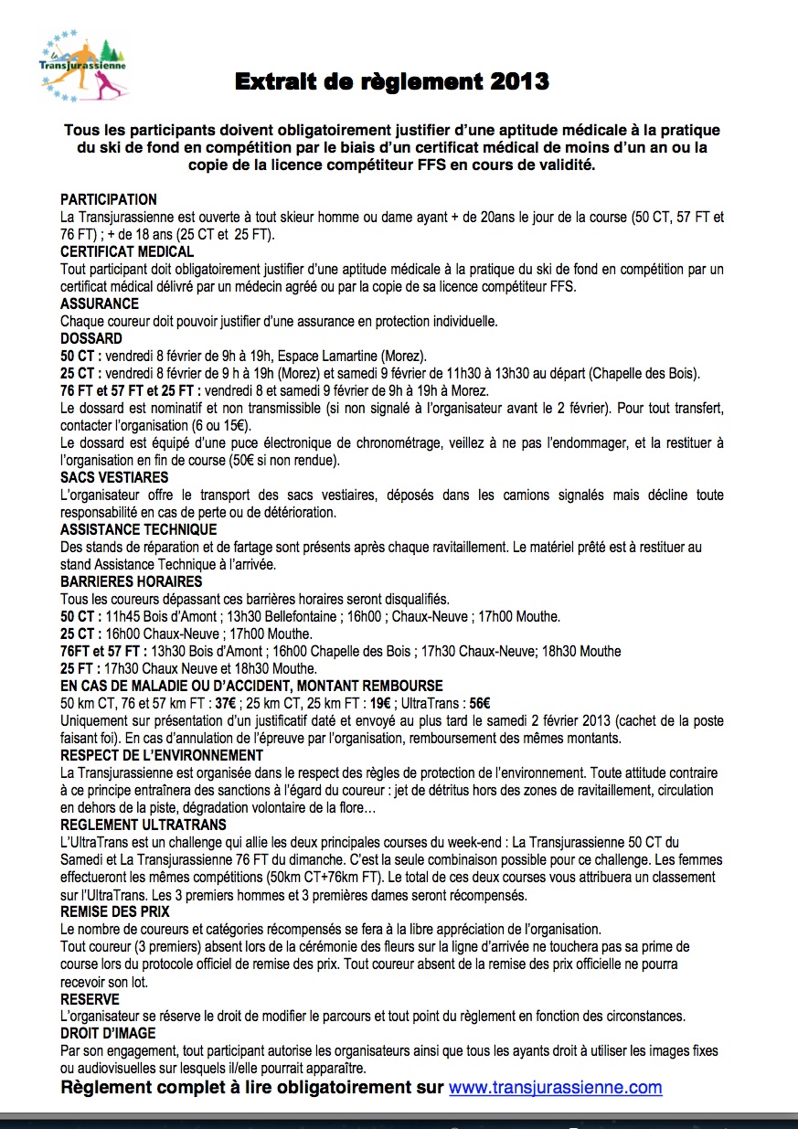 L'ensemble des informations et renseignements de La Transjurassienne 2013 est disponible sur http://www.transjurassienne.com/presentation/accueil-1-5.htm .